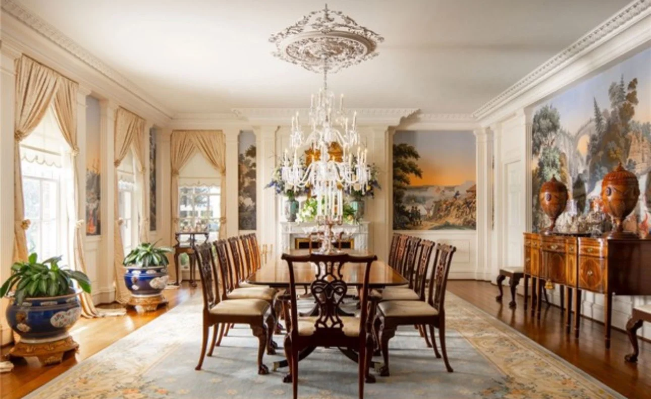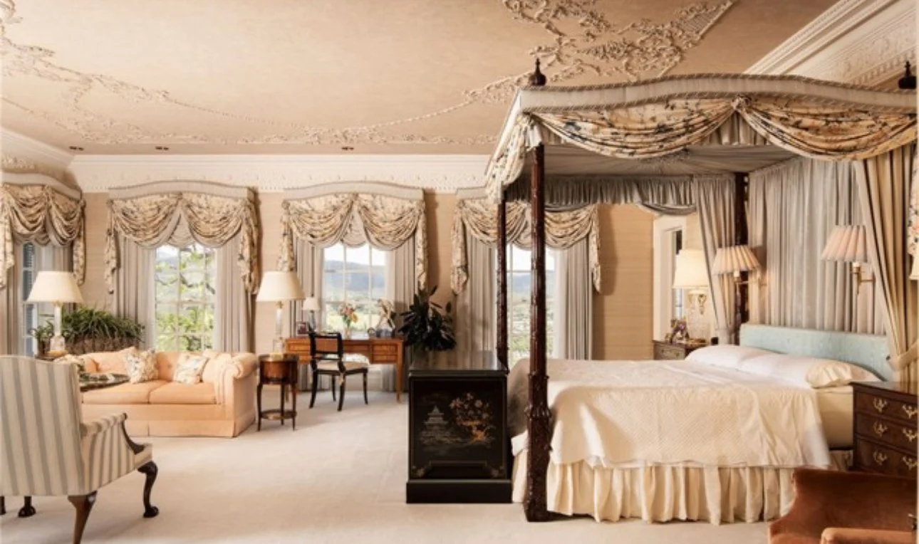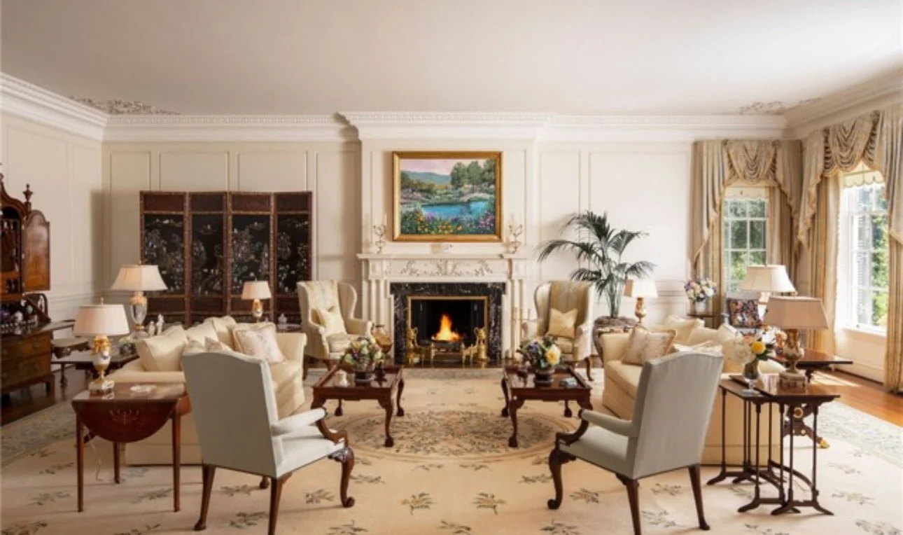 Inside, over 21,000 square feet of refined living evokes an era of diplomacy and grace, coffered ceilings, marble halls, and salons once graced by presidents. Beyond its walls, life expands to every indulgence imaginable: a private helipad, equestrian arena, championship tennis court, 70-car museum, and three guest estate, all surrounded by shimmering lakes, orchards, and the rare quiet of a world set apart.
