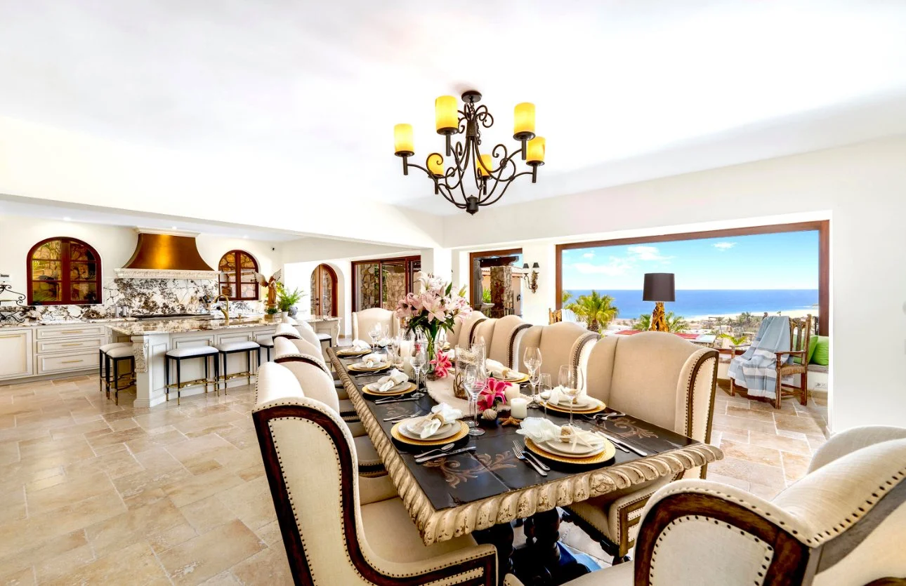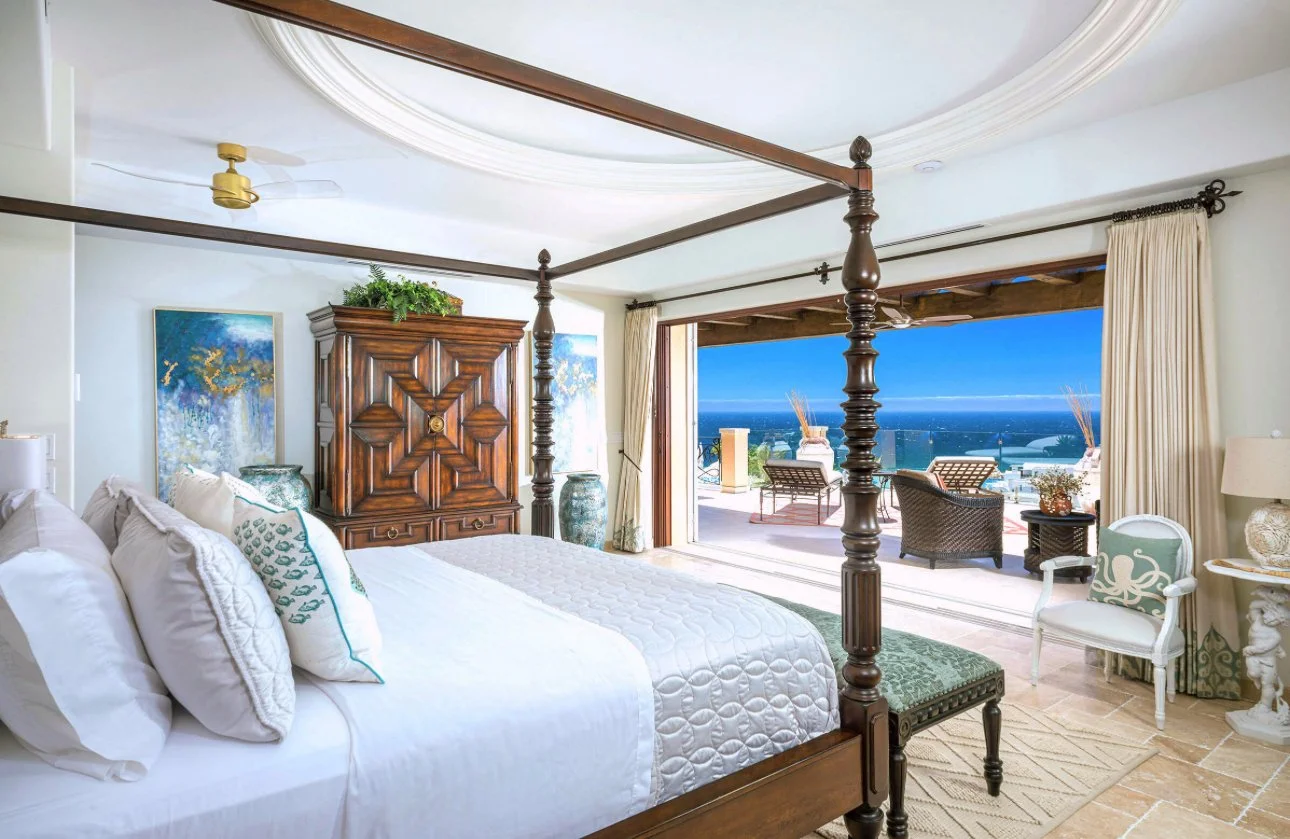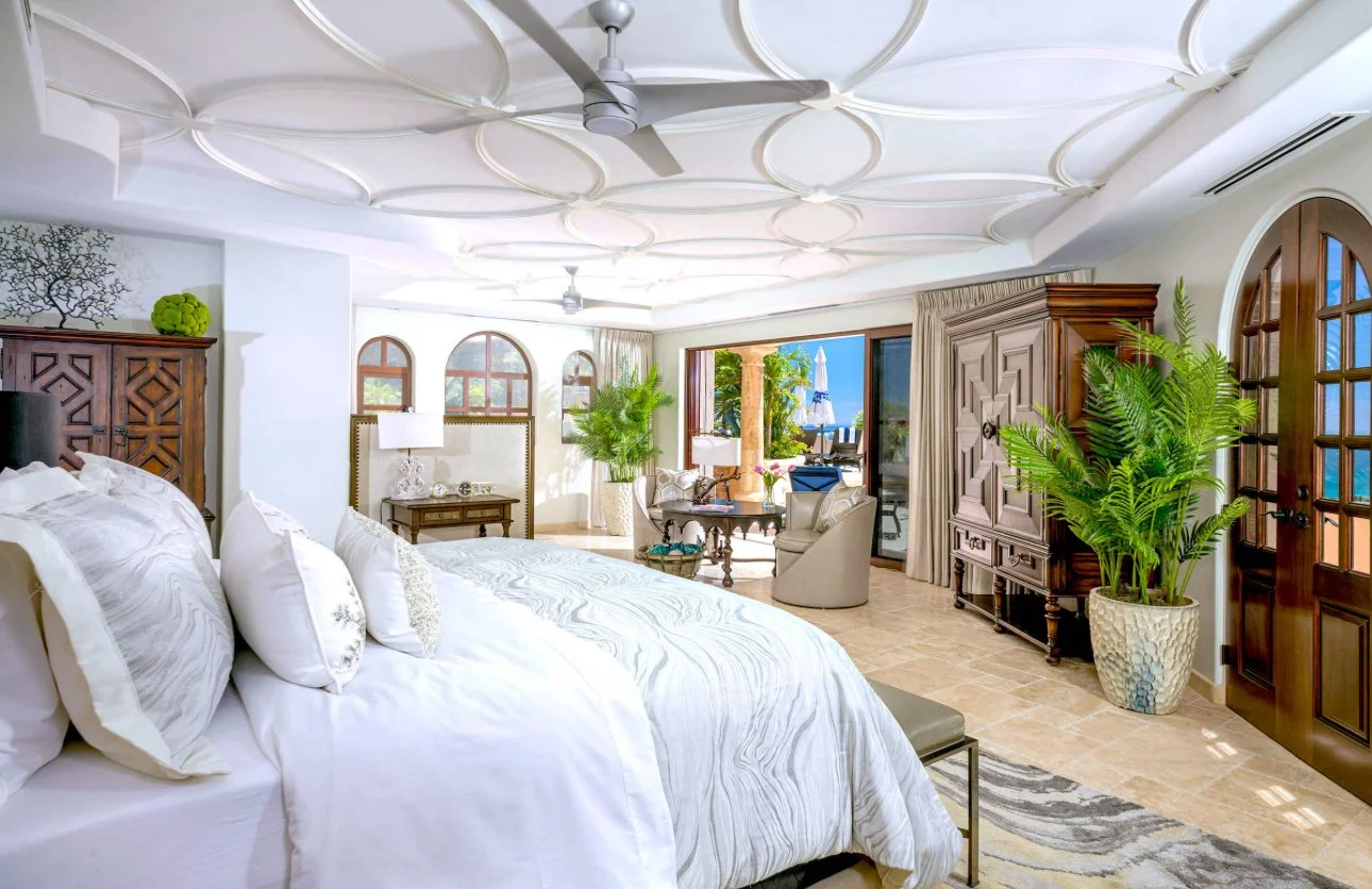 Every corridor leads to wonder, grand salons lined with carved wood ceilings, glass walls that dissolve into panoramic sunsets, and terraces where dinners unfold under violet skies. Dual chef’s kitchens whisper of Michelin-level artistry, while private pools, jacuzzis, and a tranquil spa suite turn each day into a ritual of renewal.