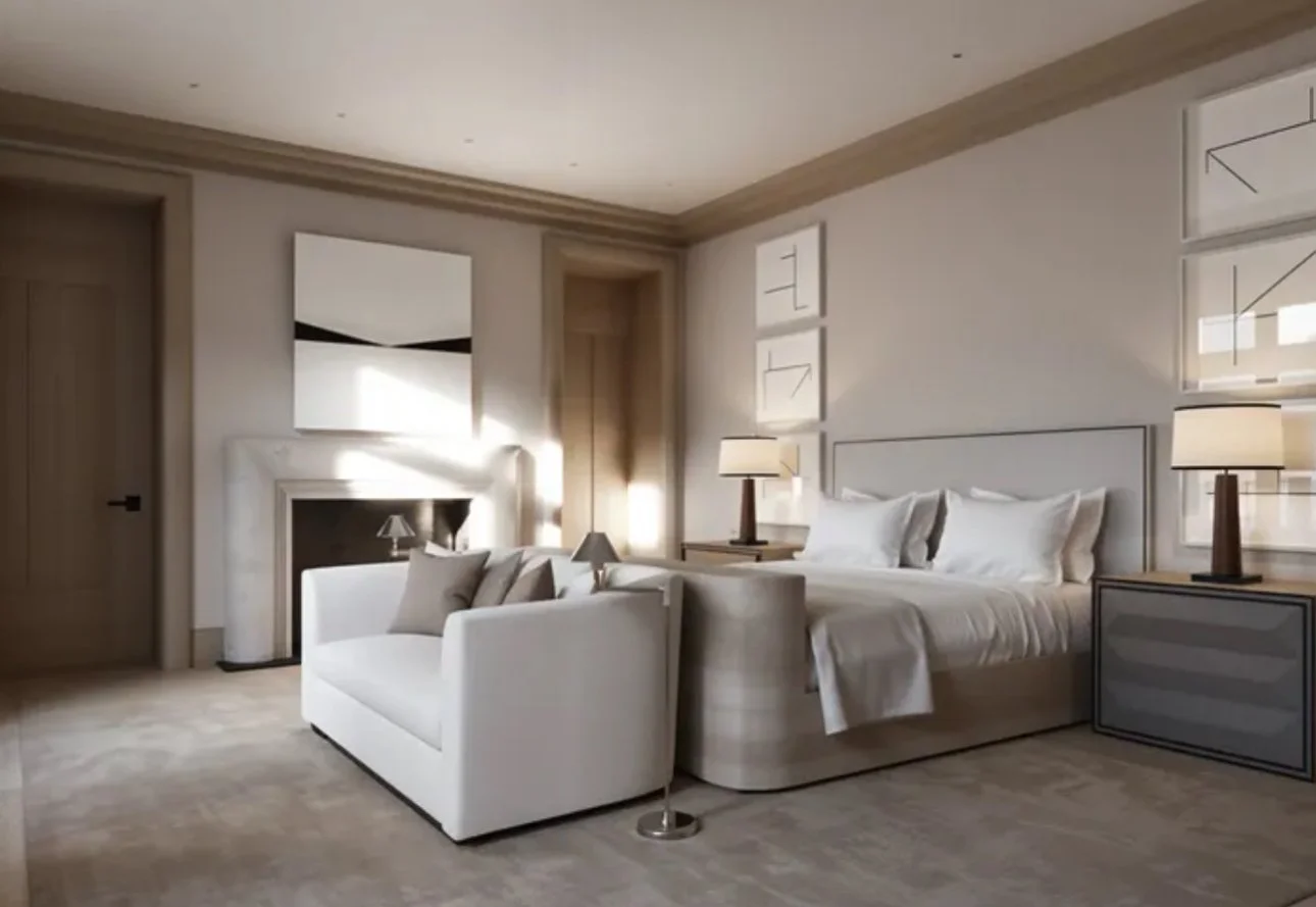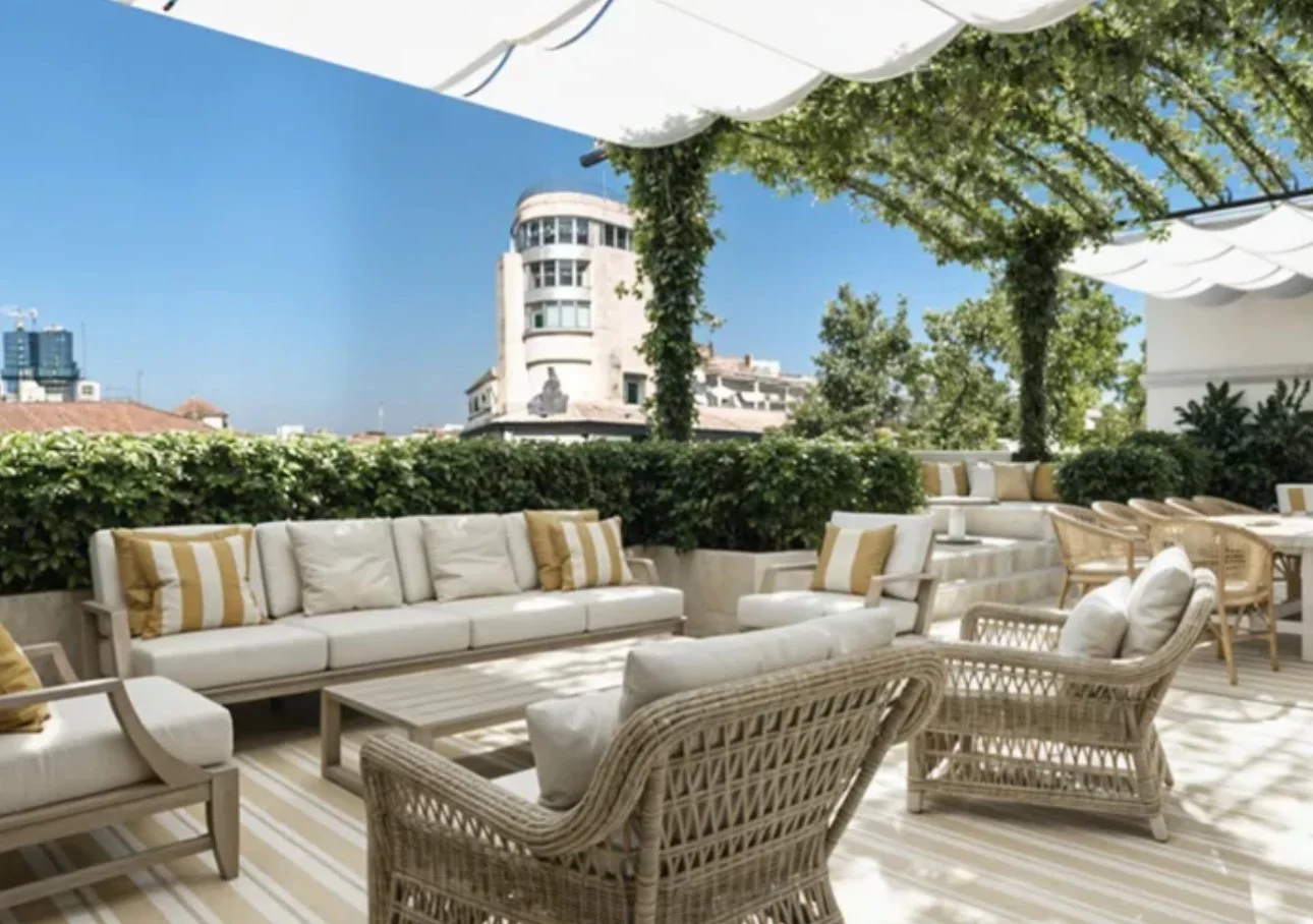 A stately entrance welcomes you into soaring salons illuminated by natural light and graced with bespoke detailing. Expansive living spaces flow toward a magnificent private terrace, a rare sanctuary that captures panoramic views of Madrid’s skyline, its monuments rising like sculpture against the evening glow. Inside, each gallery, corridor, and suite has been curated to honor timeless craftsmanship while offering the tranquility and discretion of a private palace in the sky.