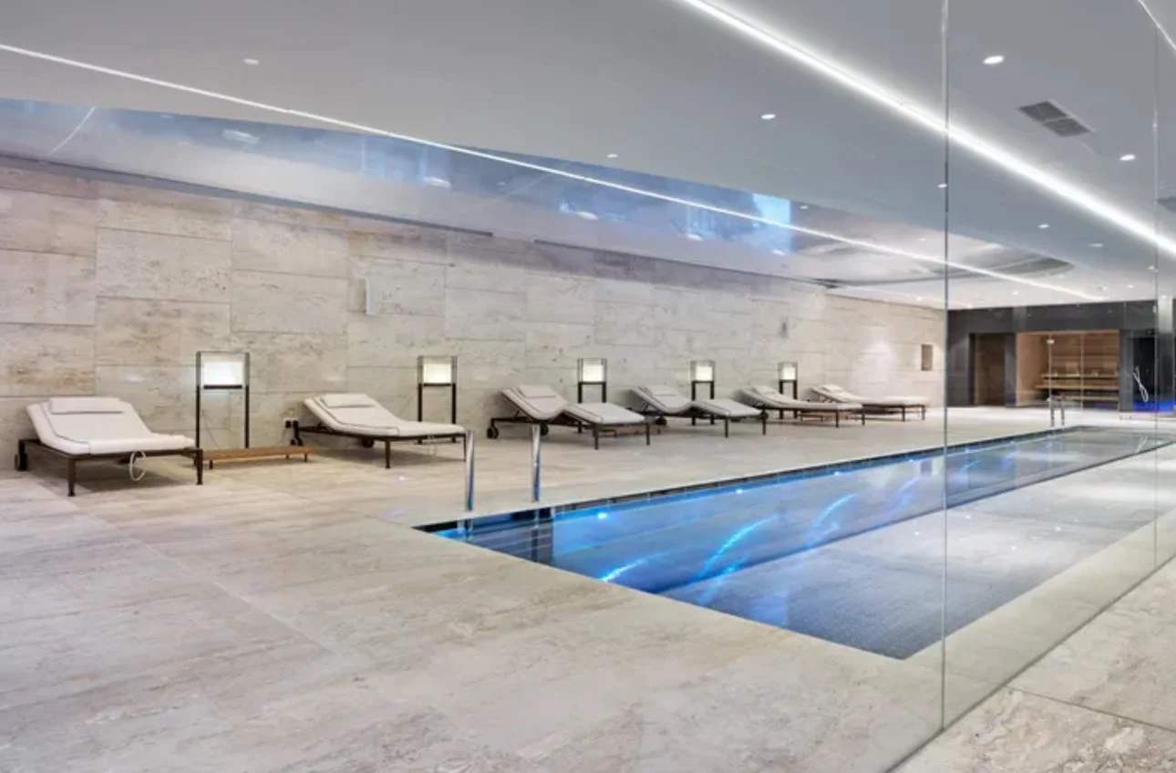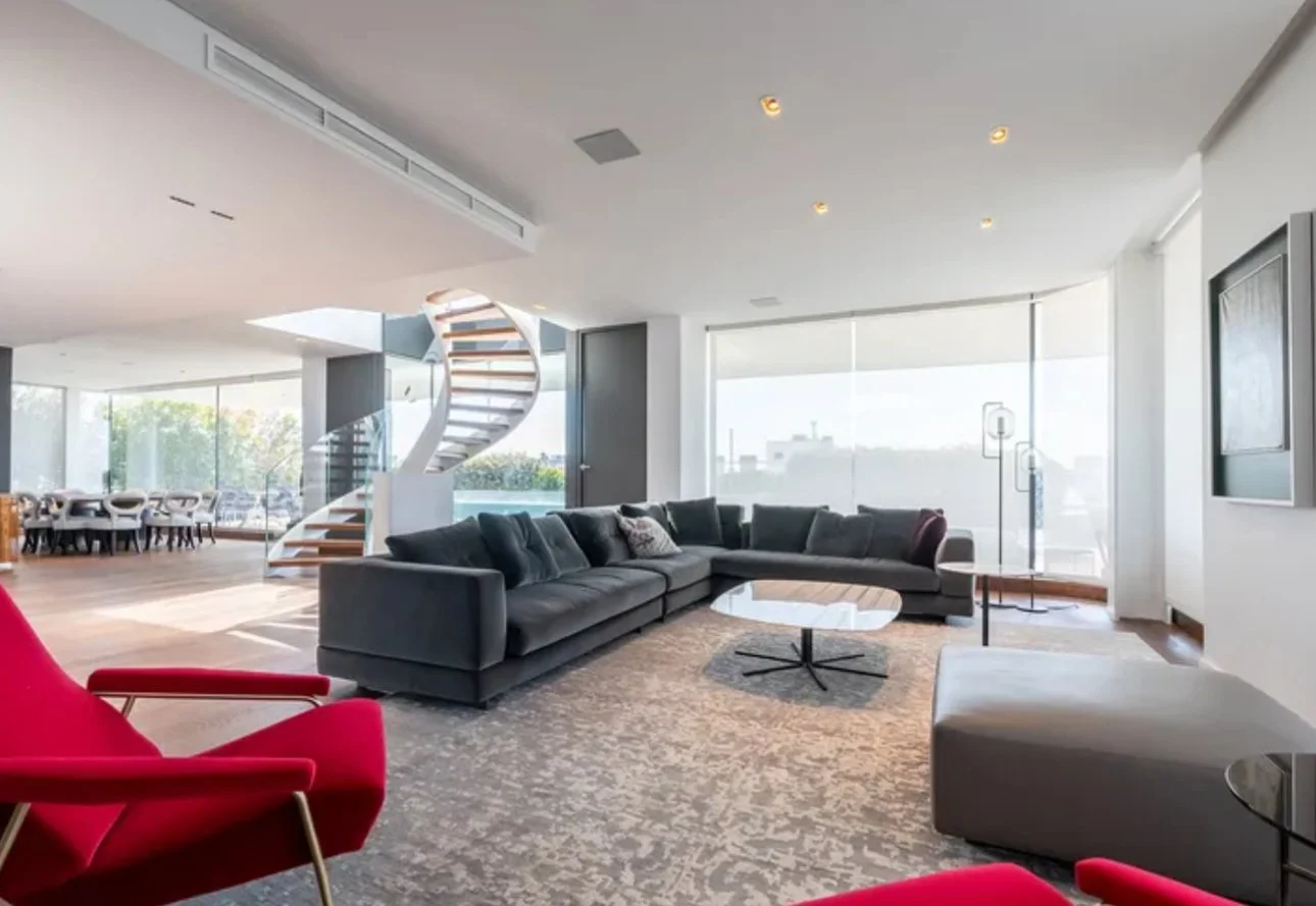 The lower level showcases expansive living and dining areas, a chef’s kitchen with separate service quarters, and a terrace that wraps the residence, complete with a heated pool for seamless indoor-outdoor living. The upper level houses four grand bedrooms, each with bespoke ensuite baths, a private TV lounge, and direct access to intimate terraces. Comfort and style are amplified with a private elevator and a sweeping spiral staircase connecting both floors.