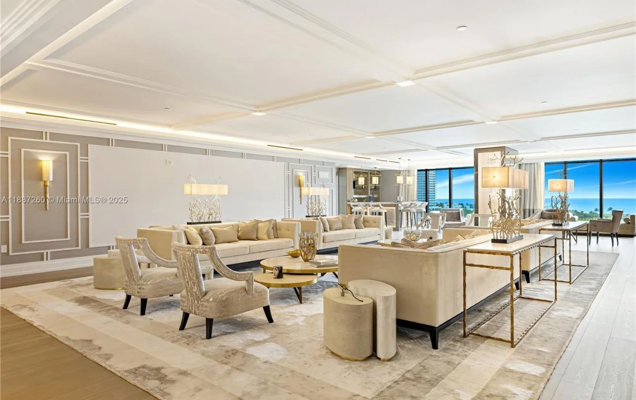 Wrapped in gold and champagne hues, the home glows with Mother-of-Pearl panels, custom European furnishings, and architectural lighting that feels almost celestial. The grand salon unfolds onto 2,471 square feet of panoramic terraces, framing ethereal views of the Atlantic Ocean, Biscayne Bay, and the Fisher Island golf course, a masterpiece of indoor-outdoor living.