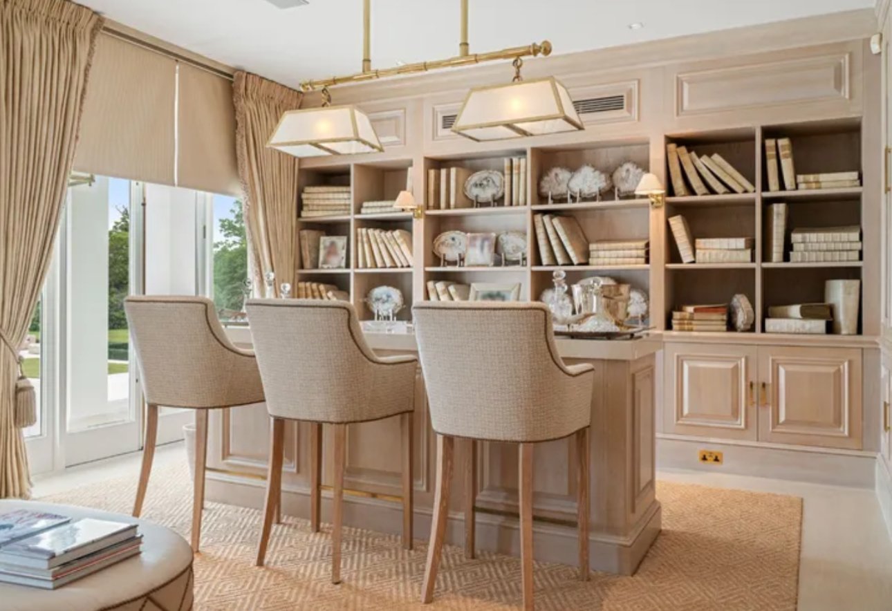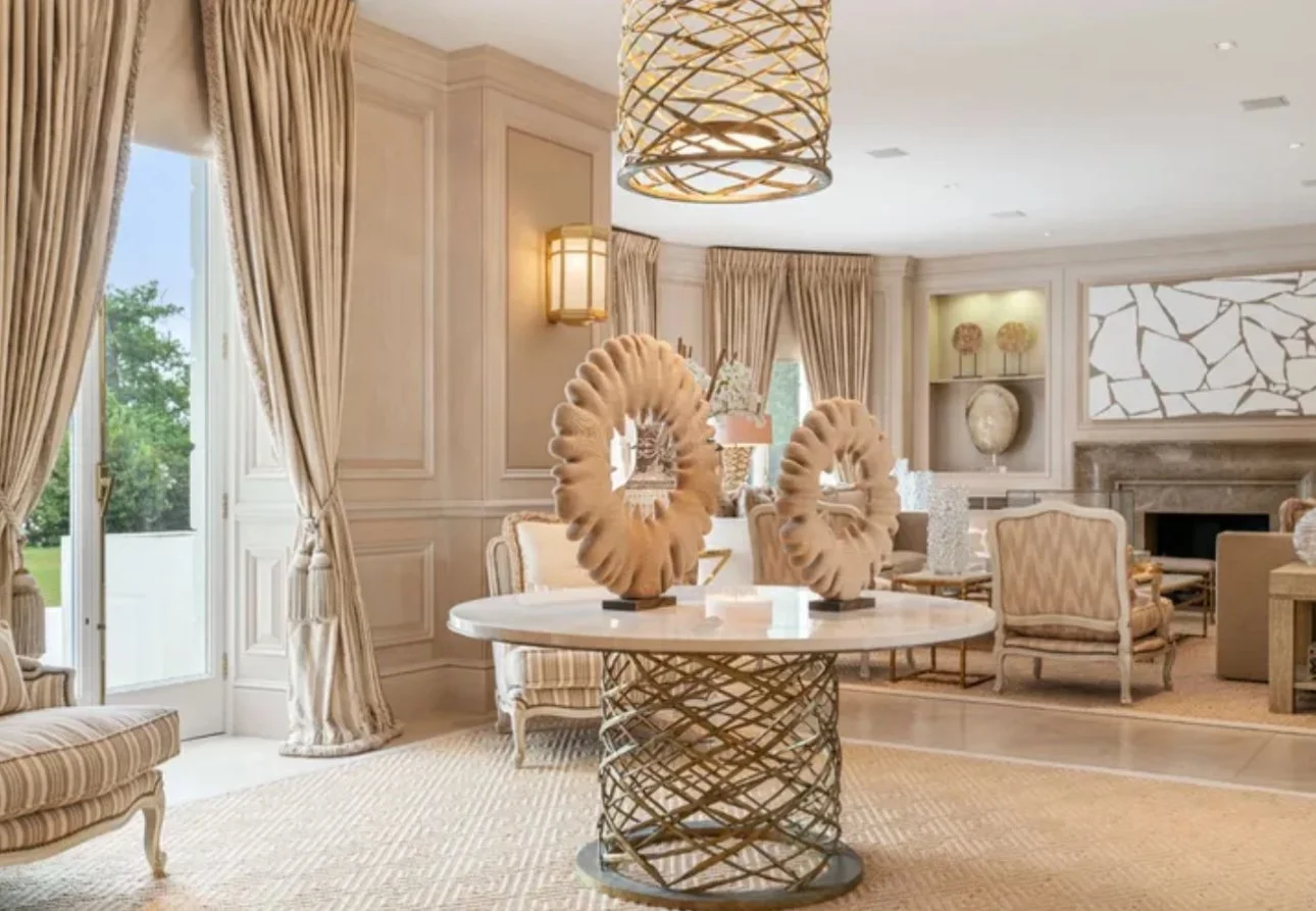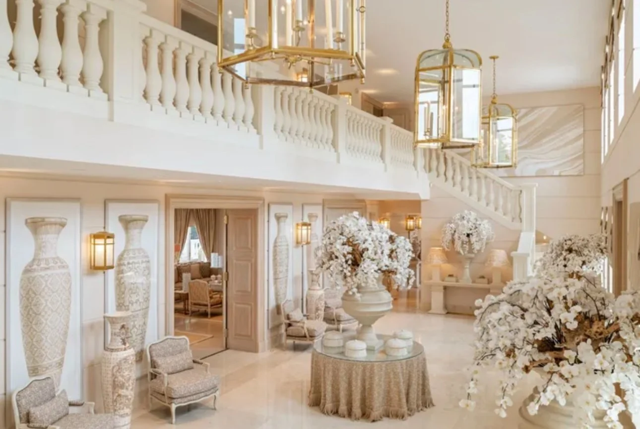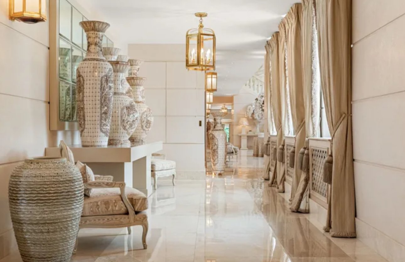 Inside, the residence unfolds like a private gallery, soaring galleried halls, sweeping reception rooms bathed in light, and formal salons designed for grand entertaining. The kitchen, crafted for both daily ease and elevated dining, opens onto views of manicured terraces and a sunlit pool. Upstairs, the principal suite reigns supreme, a sanctuary with dual dressing rooms, private sitting quarters, and a sense of intimacy that balances its scale.