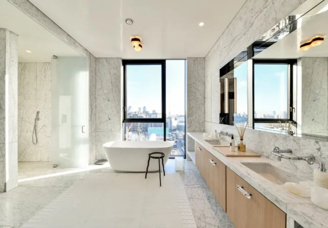 Ascending the sculptural staircase reveals an elevated sanctuary: the principal suite, two grand dressing rooms, and a dual-aspect bedroom framed by sky and skyline. Glass doors dissolve into vast terraces, where one can dine, dream, or disappear beneath the city lights.