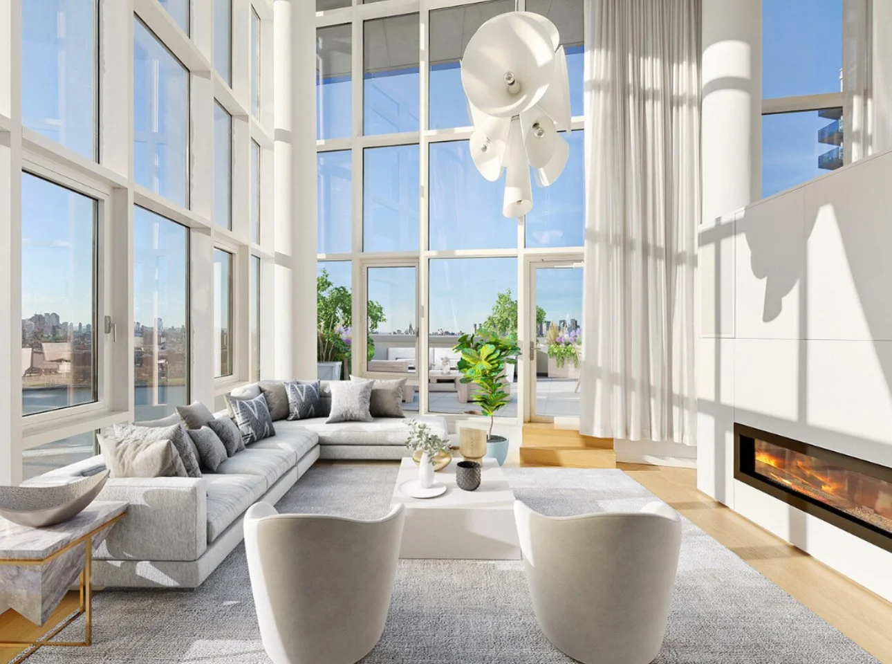 Waterfront Residences: Lofts and condos with private terraces overlooking East River and Manhattan skyline.